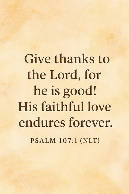 “Give thanks to the Lord, for he is good! His faithful love endures forever.” — Psalm 107:1 (NLT)